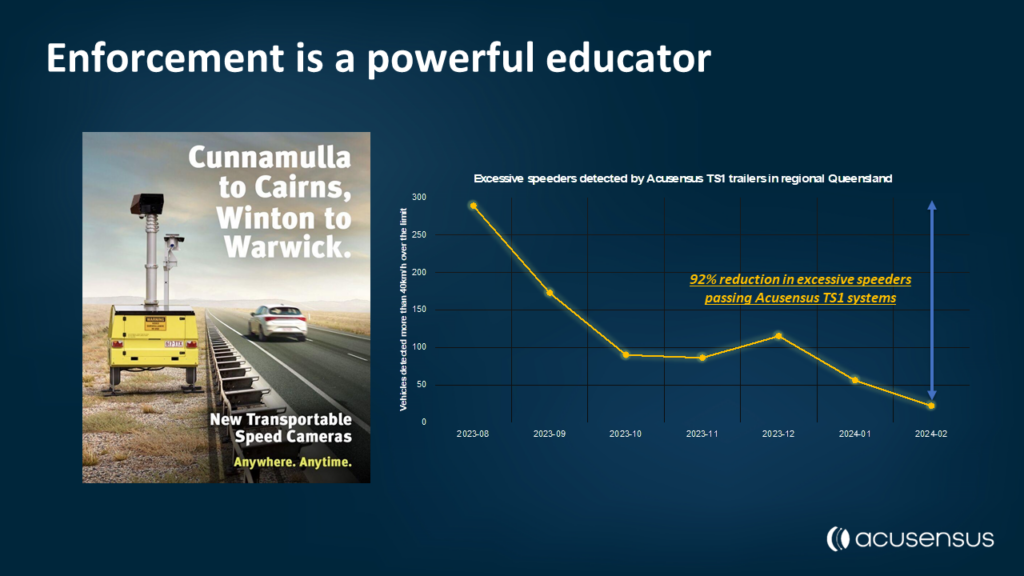 The power of enforcement tools in educating the public can be observed through a change of driver behaviours in QLD. The number of drivers caught excessively speeding by the TS1 cameras has declined by 92% over the first seven months of the program.
